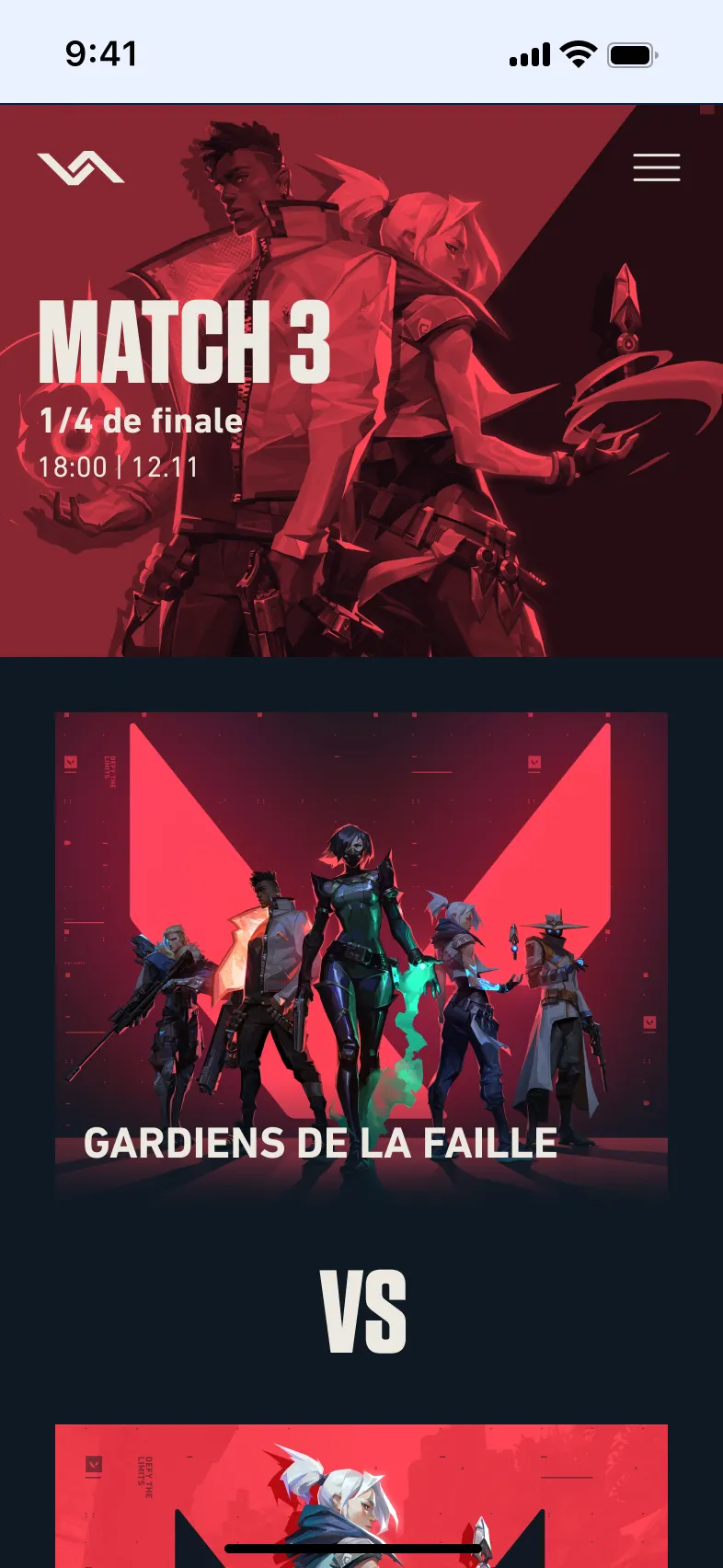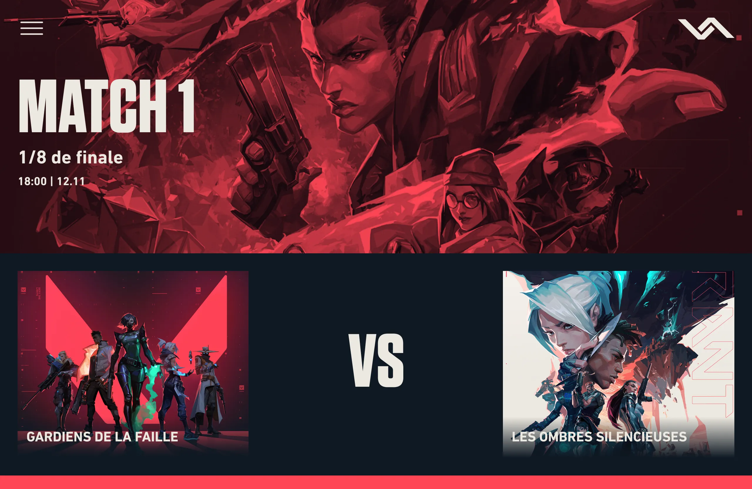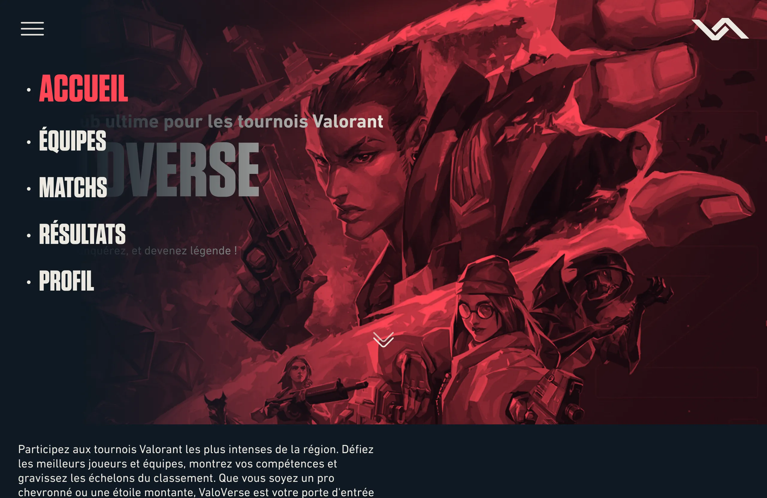 Dans le cadre d'un projet d'examen, j'avais trois jours pour concevoir et développer un site web pour la gestion d'un tournoi de jeu vidéo Valorant. Le défi a mis à l'épreuve notre capacité à produire un produit fonctionnel et visuellement attrayant sous des contraintes de temps strictes.